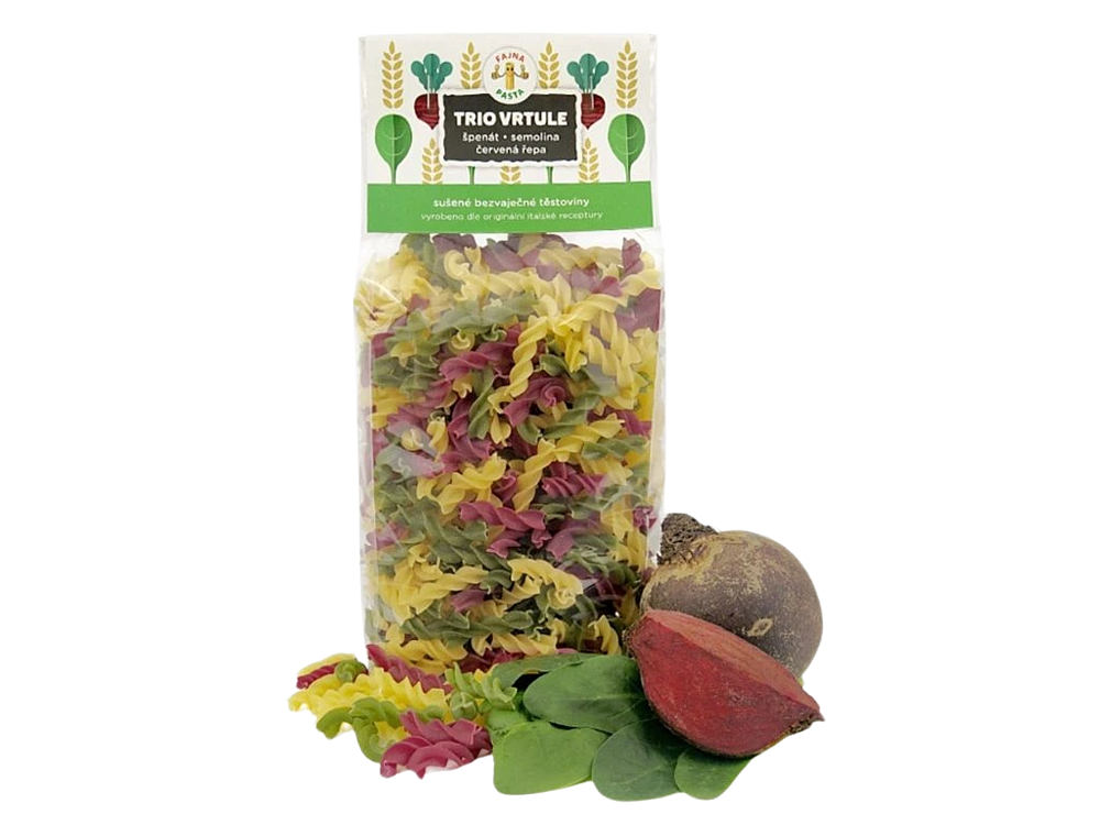 Barevné těstoviny TRIO vrtule (italsky fusili) jsou dokonalou kombinací tří chutí a barev – červené řepy, zeleného špenátu a čisté semoliny. Díky spirálkovému tvaru perfektně zachytí omáčky i kousky zeleniny. Kromě toho, že barevné vrtule vypadají na talíři fantasticky, mají i skvělou chuť díky vysokému podílu zeleniny. V našich řemeslných těstovinách nenajdete žádné umělé přísady, jen jemné přírodní tóny.