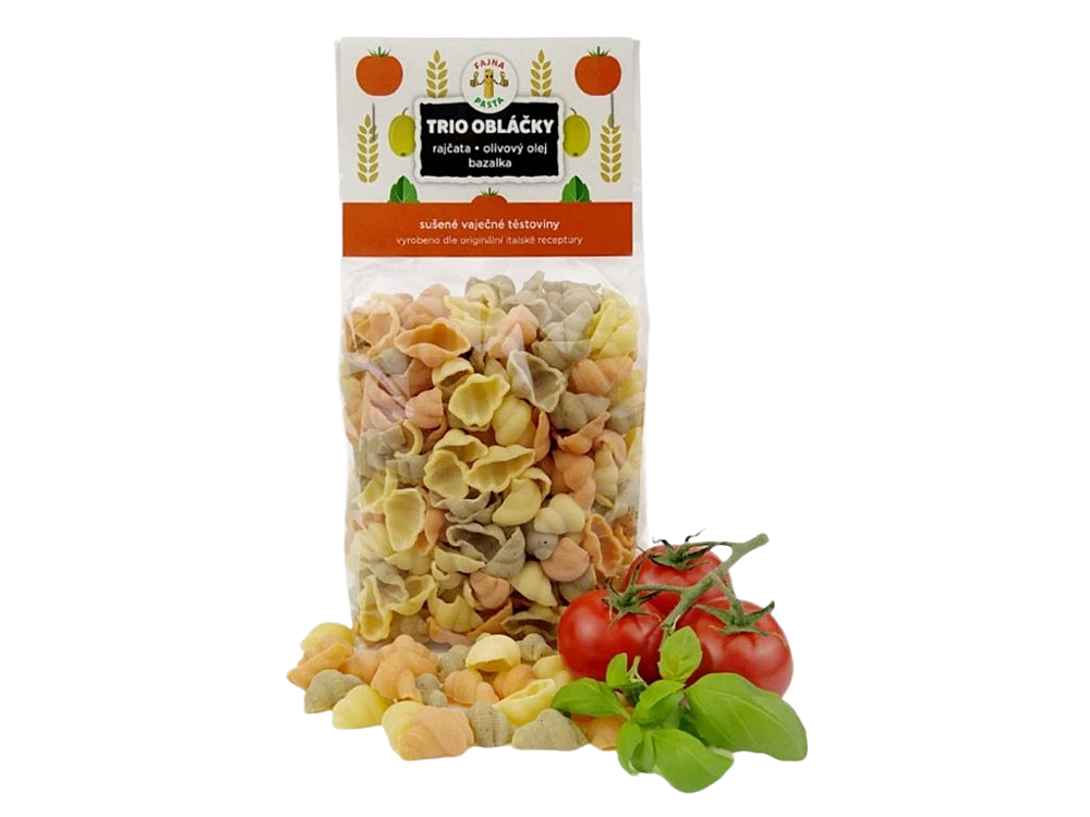 TRIO obláčky jsou těstoviny, které hrají všemi barvami. V balení najdete všechny tři ochucené druhy těchto těstovin – bazalkové, rajčatové i s olivovým olejem. Vaše jídlo tak bude nejen výborně chutnat, ale i skvěle vypadat. Tvar otevřené mušličky není jen estetický, ale hlavně praktický. Zachytí totiž chuť a vůni každé vaší oblíbené omáčky.