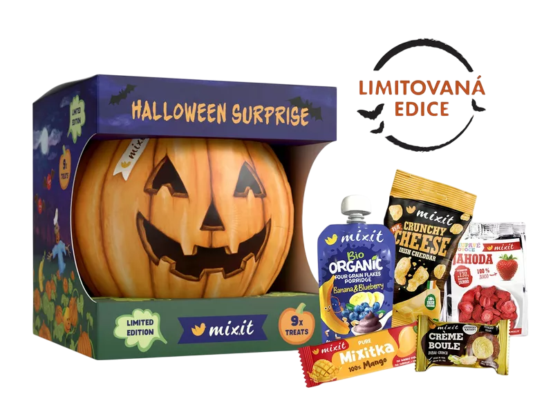 Halloweenská dýně plná dobrot není jen nejděsivější dekorace na oslavu – je to prokletý poklad plný nejoblíbenějších Mixit dobrot! Uvnitř najdete křupavý irský cheddar, Křupavou jahodu, pečenou a dubajskou Créme bouli i další bestsellery. Každá dýně ukrývá celkem 9 pečlivě vybraných dobrot tak, aby potěšila malé i velké koledníky. Ideální jako halloweenský dárek nebo společné mlsání během strašidelné party.
